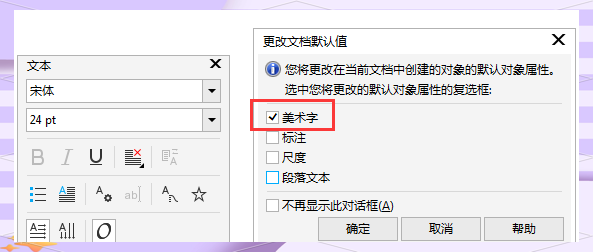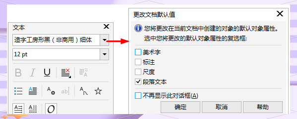 - 展开字体列表:在“字体列表”中,点击右侧的黑三角以展开完整的字体选项。选定默认字体后,会出现一个“更改文档默认值”的复选框。您可以根据个人需求,自定义选择默认字体为“美术字”或“段落文本”,甚至是同时选择两者。